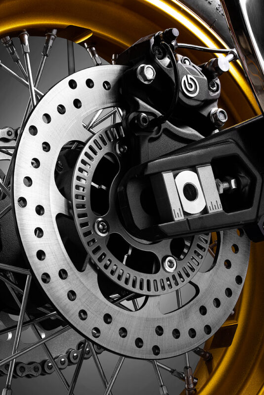 El sistema de frenado, con ABS desconectable, puede contar con equipamiento firmado por Brembo. Las horquillas Marzocchi son totalmente ajustables. Los neumáticos Pirelli Scorpion Rally STR son imprescindibles para disfrutar de cualquier tipo de ruta.